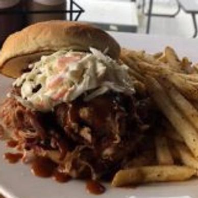 Sandwich is Chopped Beef Brisket. 1/2 pound dinner includes your choice of 2 sides.
